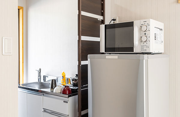 テレビ(ダブルルームは50型。セミダブルルームは32型)・冷蔵庫・エアコン・電子レンジ・IHコンロ・簡易調理器具・食器類・シャンプー・コンディショナー・ボディソープ・歯ブラシ・歯磨き粉・ティッシュ・フェイスタオル・バスタオル